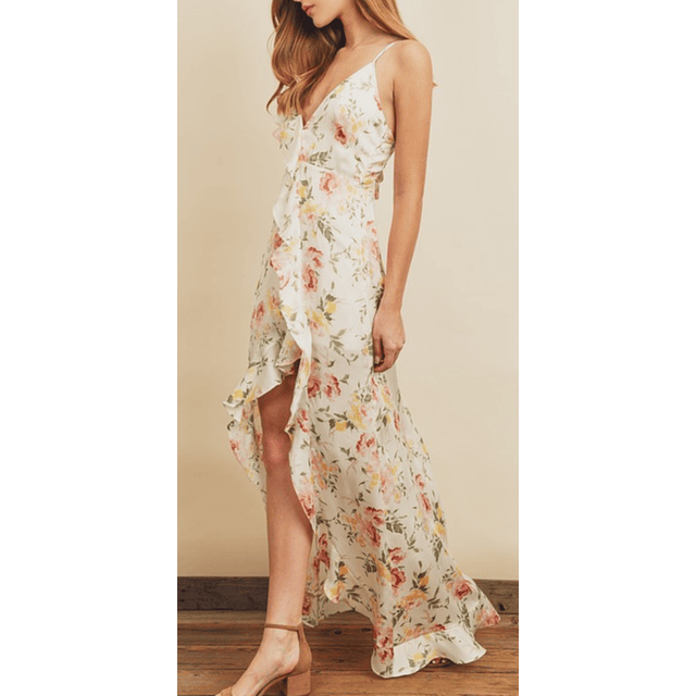 Maxi Vestido de raso, fondo blanco con estampado de flores, tirantes ajustables.
