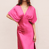 Maxi Vestido Fucsia, satinado, escote en V y 1/2 manga.