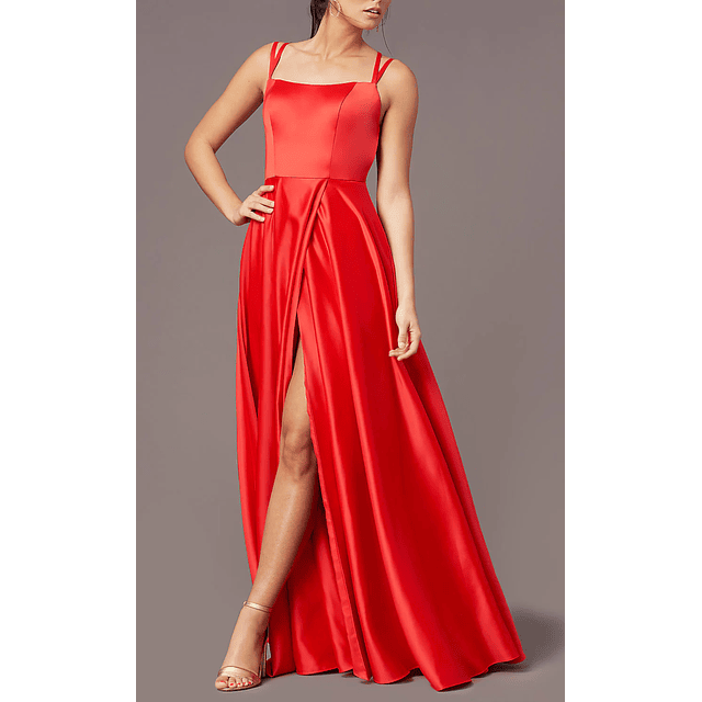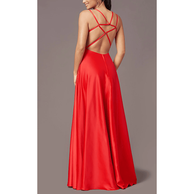 Maxi Vestido rojo, falda amplia, abertura en la pierna. Espalda rebajada con tirantes cruzados.