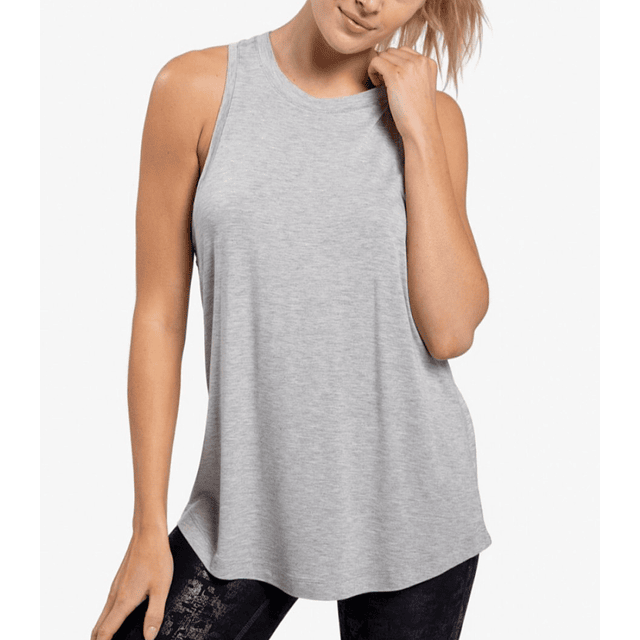 Polera gris de algodón, cuello redondo, espalda rabajada.