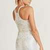 Top blanco con dorado, almohadillas removibles. 77% nylon, 23% spandex. Tela estira en cuatro direcciones y absorbe la humedad.
