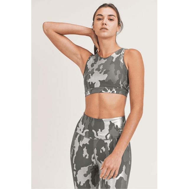 Top camuflado en tonos verde y gris , 75 % Nylon 25 % Spandex. Estiramiento de la tela en cuatro direcciones, absorción de la humedad. Almohadillas removibles.